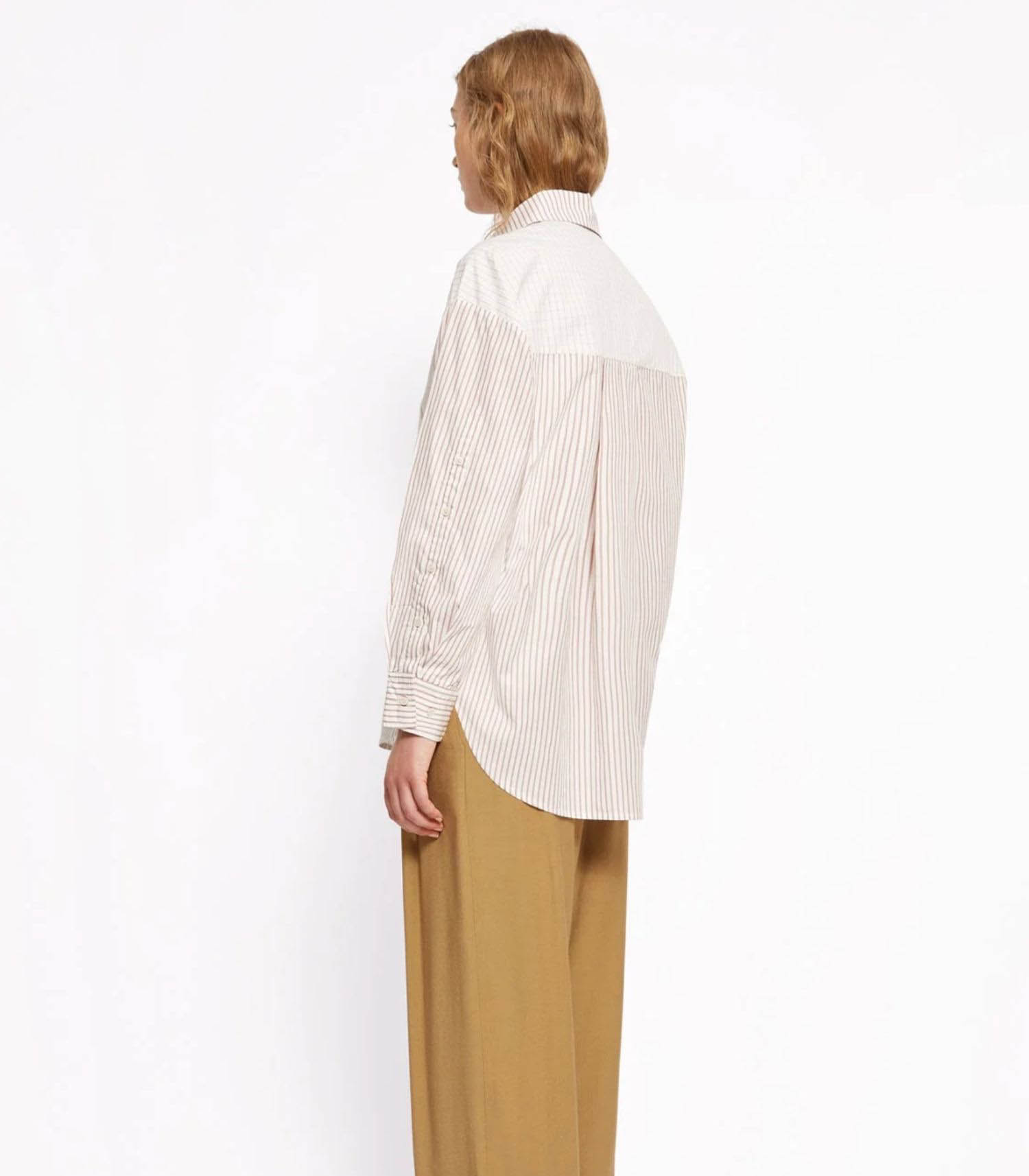 Chemise Edmond rayures Bordeaux de la marque Roseanna. Un essentiel à l’allure contemporaine, cette chemise se distingue par son jeu de rayures façon patchwork, un mélange audacieux de pans distincts fusionné dans un esprit graphique raffiné. Confectionnée en popeline de coton biologique, tissée en Italie, elle adopte une coupe droite et arbore une broderie stylisée “?R” pour une signature Roseanna subtile et moderne.