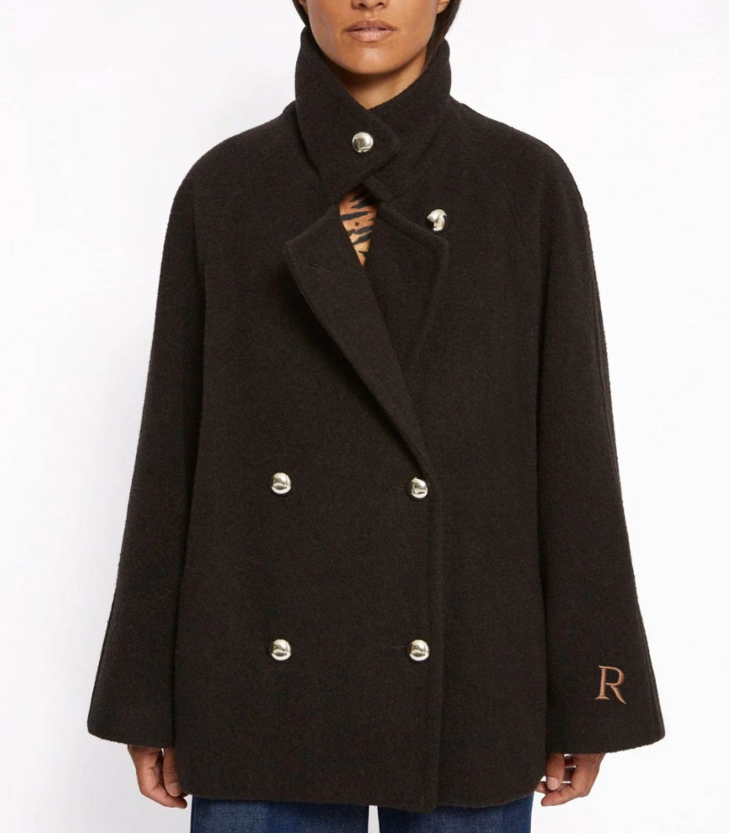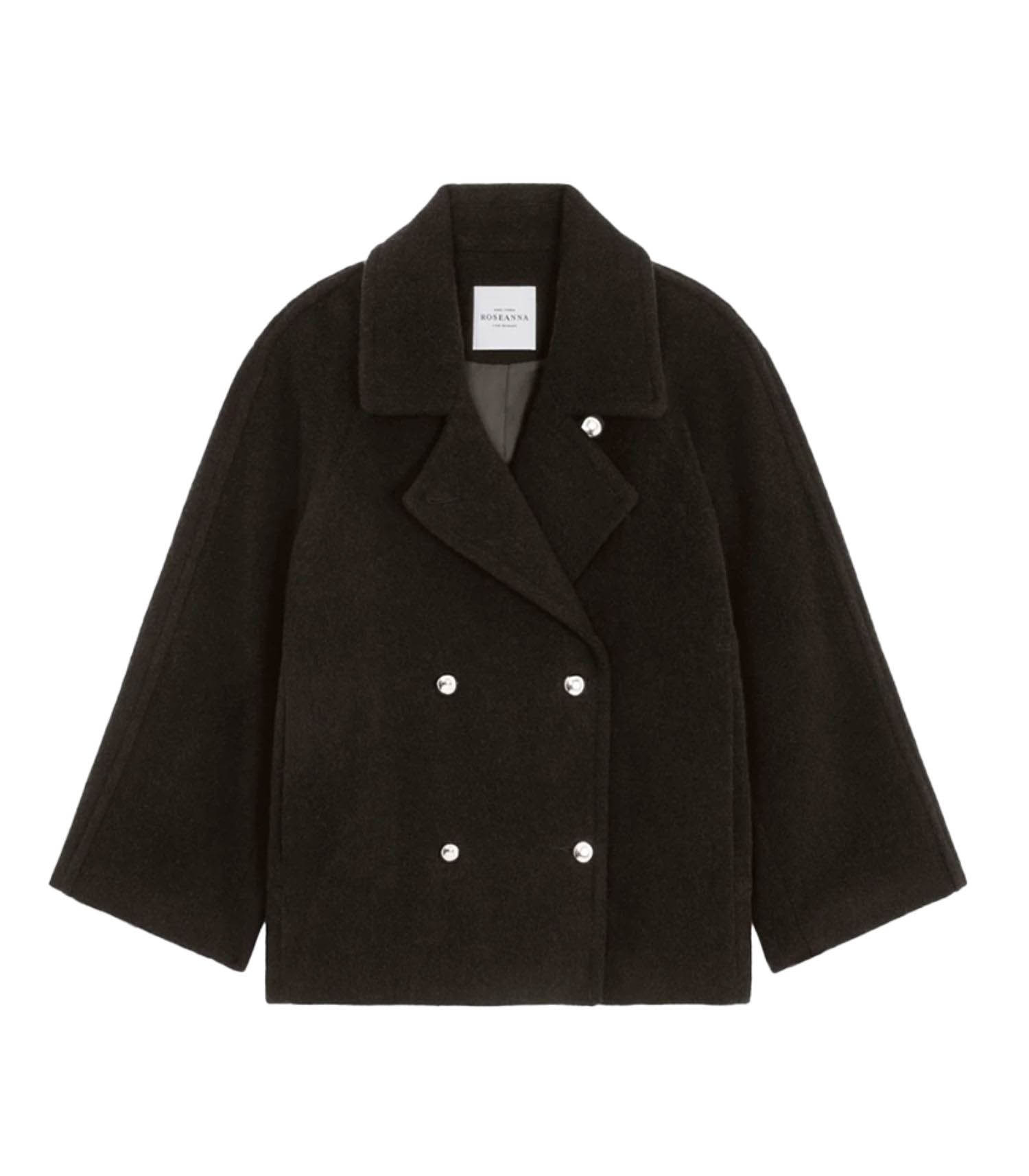 Le double boutonnage, accentué de boutons métalliques qui contrastent avec la teinte sombre, impose une cohérence visuelle forte : fermée, la pièce génère un côté presque militaire élégant, ouverte, elle peut se porter en surcouche légère.