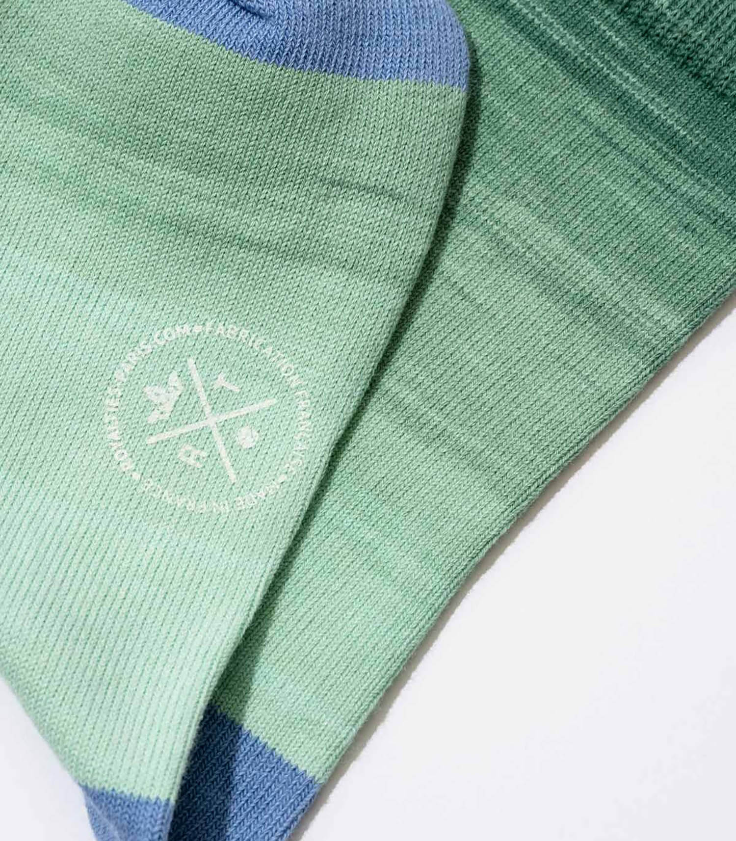 Chaussettes Judy Menthe de la marque Royalties, une paire de chaussettes qui se distingue par son coloris dégradé vert menthe contrasté par des pointes et des talons bleus. Un modèle original rythmé par une note de fraîcheur et d'éclat. Remaillage fin et solide.