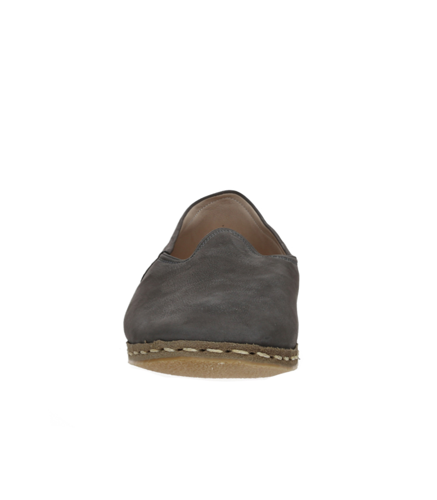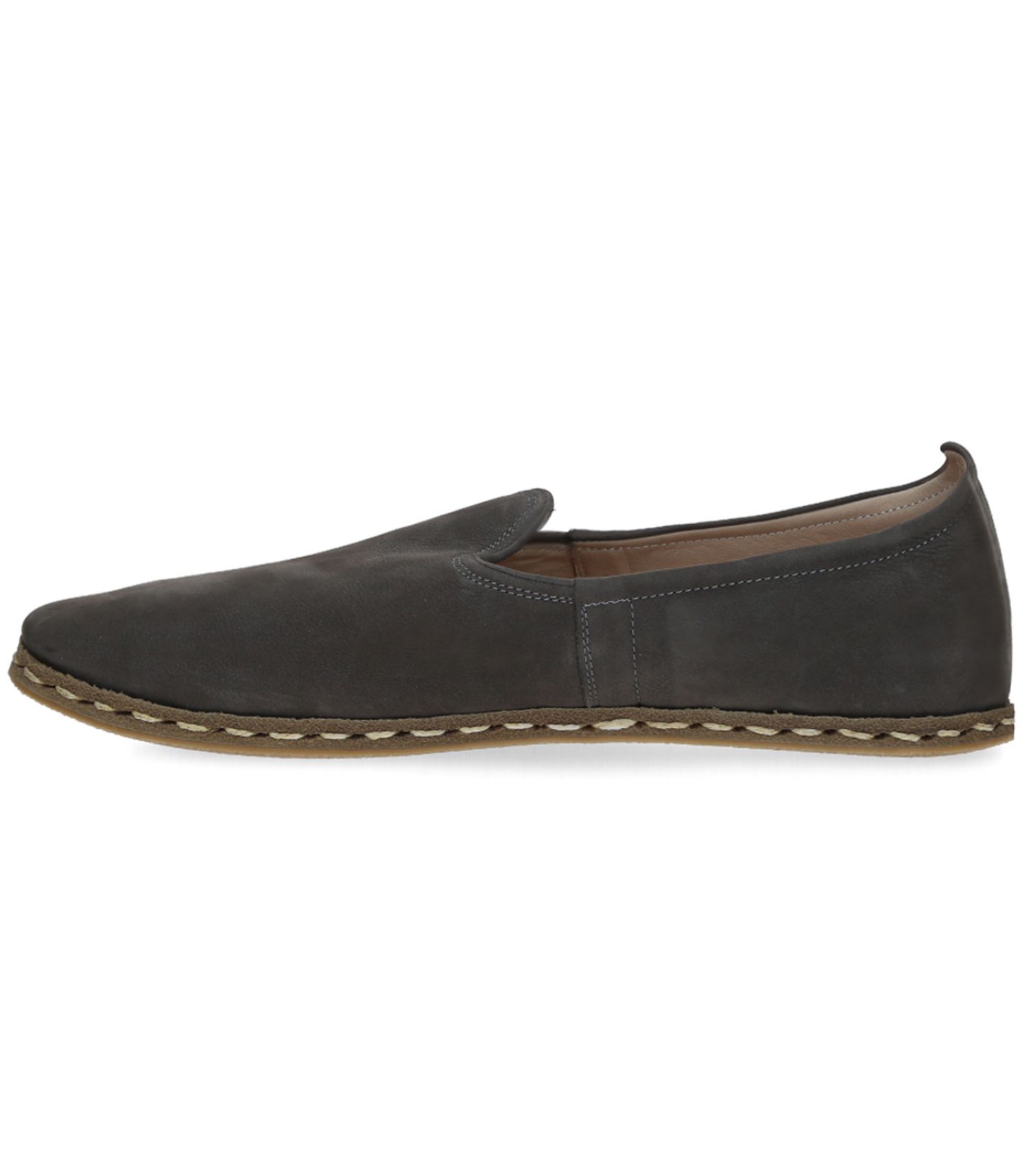 Mocassins Saanas pour homme en nubuck, modèle Classique, coloris Gris. On apprécie particulièrement le confort apporté par la doublure en chevreau, très douce et respirante pour le pied. Ces mocassins ont été entièrement fabriqués et cousus main, sans agent synthétique et en quantité limitée pour éviter toute surproduction.