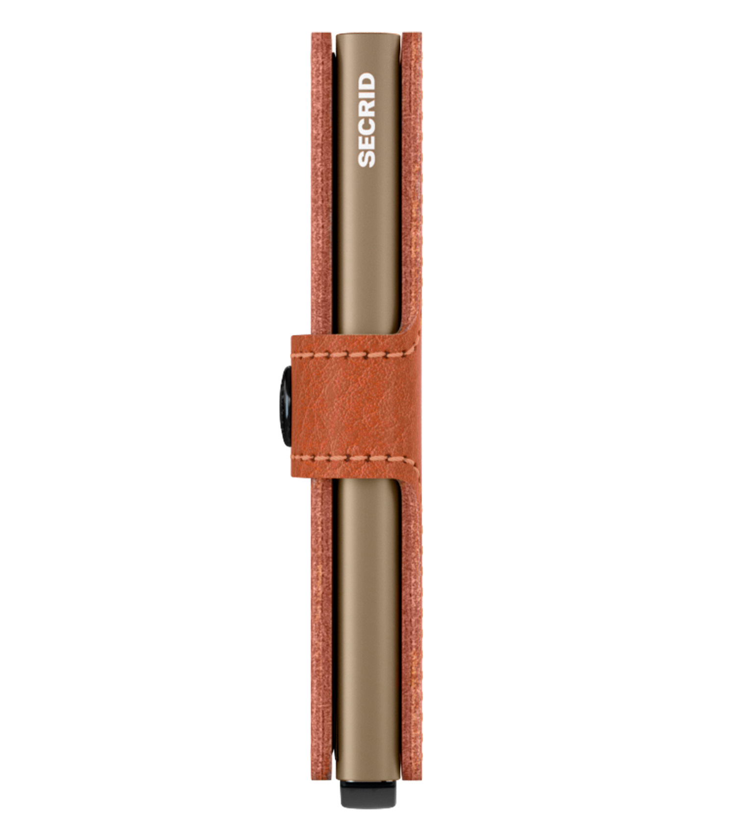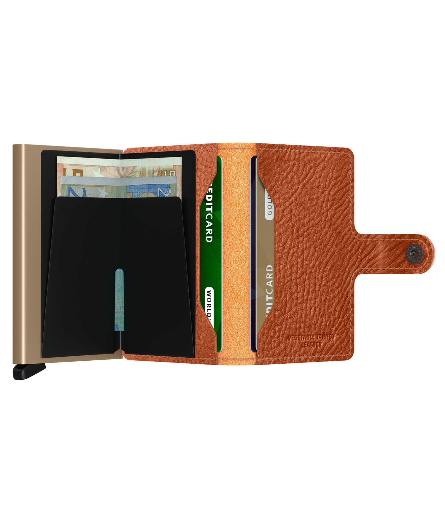 Porte-Carte Secrid, modèle Miniwallet Veg Caramello - Sand conçu dans un cuir caramel à tannage végétal pour une réalisation respectueuse de l'environnement. Un objet élégant, astucieux et ingénieux avec son format compact à ouverture à bouton pression, qui dévoile différents rangements pour cartes, billets, ainsi qu'un porte-cartes intégré à ouverture pratique qui protège vos cartes bancaires contre la fraude et la casse.