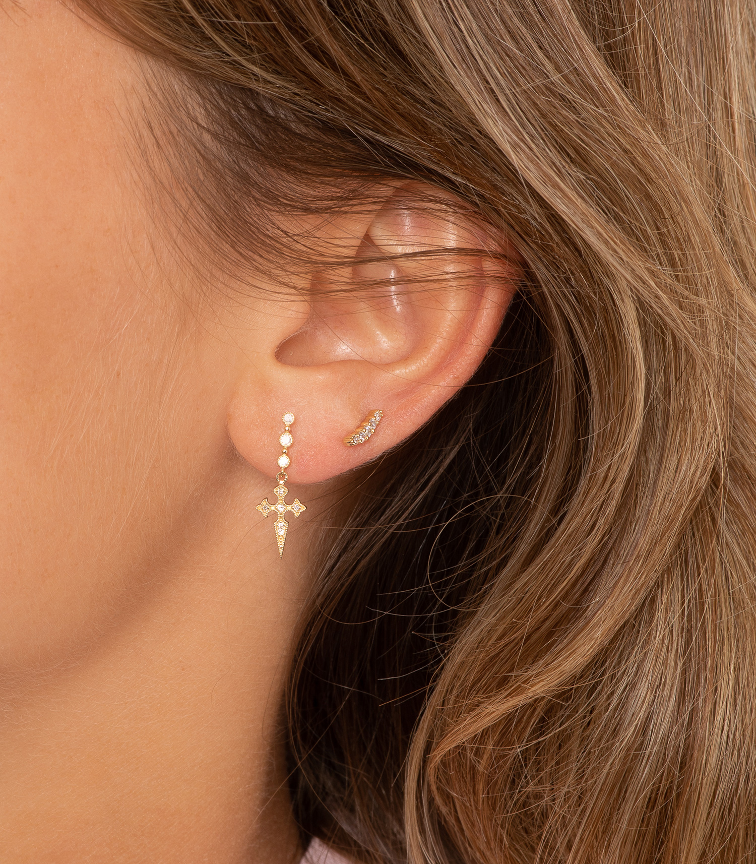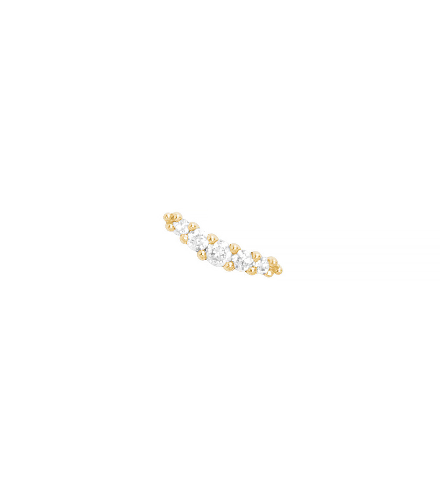 Parfaite pour donner une touche d'éclat à vos compositions de bijoux tout en se voulant très discrète, la boucle d'oreille Line des collections Stone se décline en or jaune lumineux et se veut entièrement sertie de petits diamants blancs.