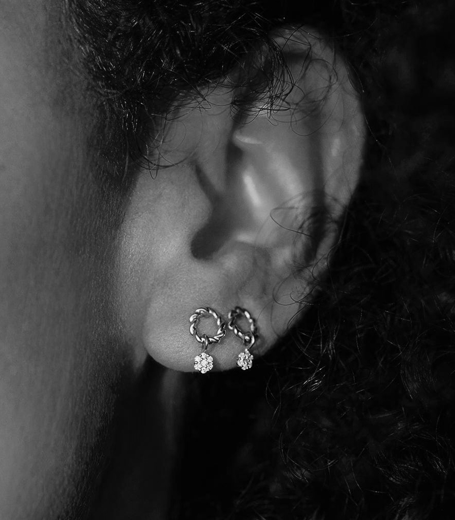 Boucle d'oreille Puce Dunaway Or Blanc et Diamants de la marque Stone Paris, une jolie petite boucle formant un anneau torsadé agrémenté d'un charme boule sertie de diamants blancs. Une pièce féminine et originale, qui reste discrète avant tout.