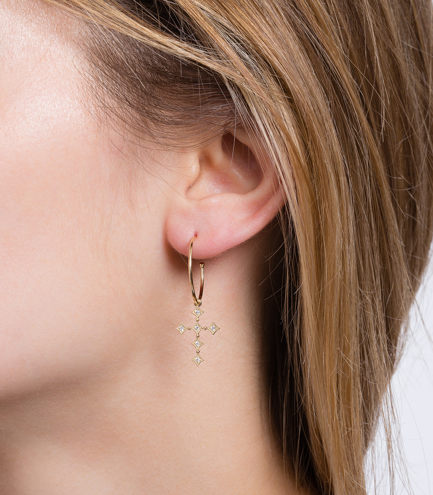 Les créoles Divine en or jaune unissent les univers rock et vintage, deux thèmes chers à Stone Paris. La croix est un symbole récurrent de la marque, évoquant autant la tradition que la recherche spirituelle. Ces créoles en or jaune 18 carats sont serties de 12 diamants fins.