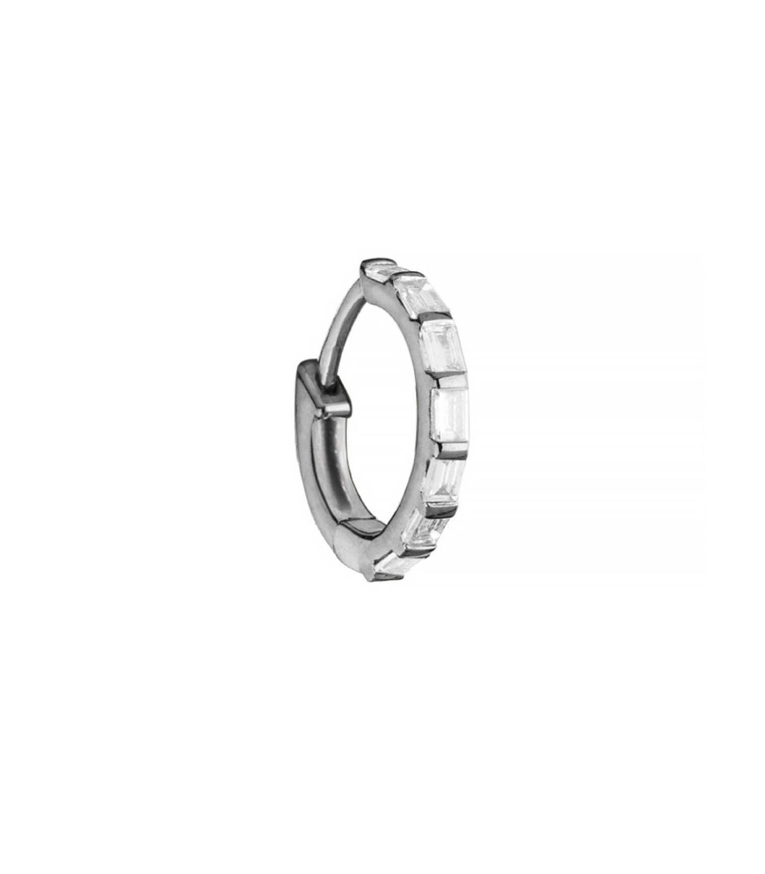 Beauté sombre, cette mini créole baguette or noir Stone Paris est issue de l’univers inspiré et délicat de la créatrice Marie Poniatowski. Fabriquée en France, cette boucle d’oreille unique se distingue par un anneau en or noir 18 carats sur lequel sont alignés 7 diamants blancs.