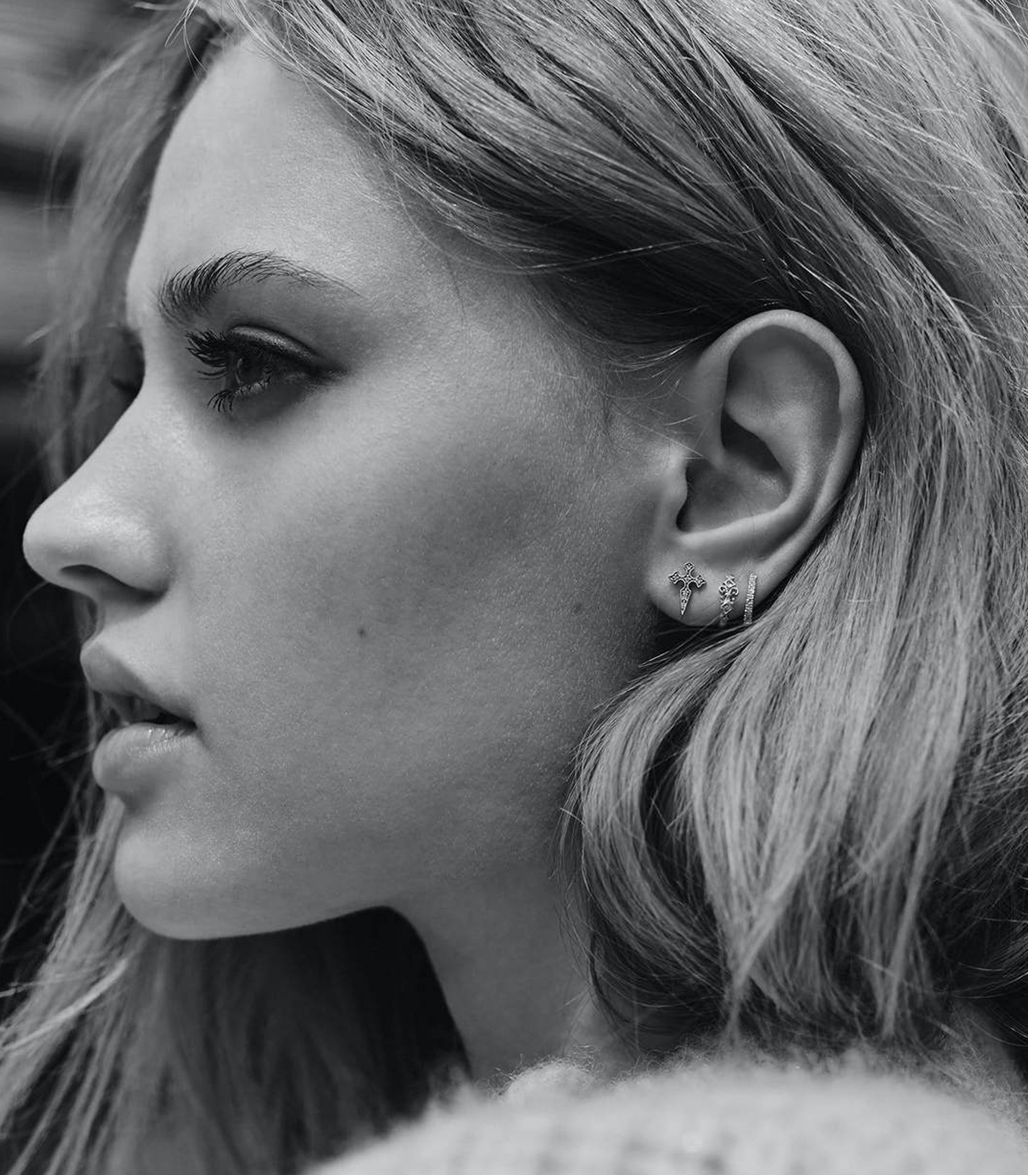 Stone Paris signe cette Mini Créole Double Glory en or noir et diamants. Elle se compose de deux anneaux, un simplement pavé de diamants et un travaillé en forme d'arabesques pavées de diamants. Sa construction est pensée pour se porter sur l'oreille droite, l'attache pour l'oreille étant positionnée au niveau du motif en arabesques.