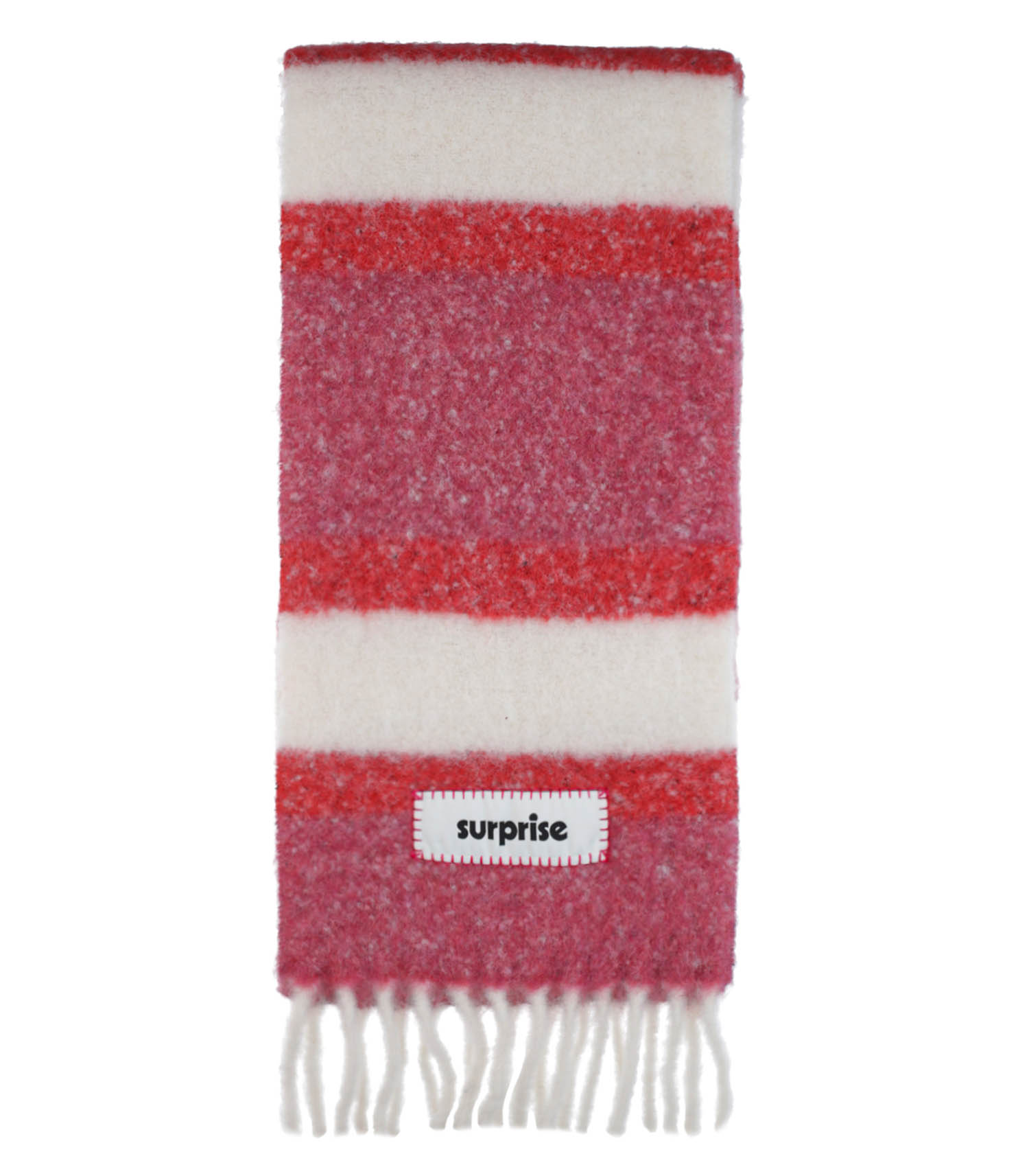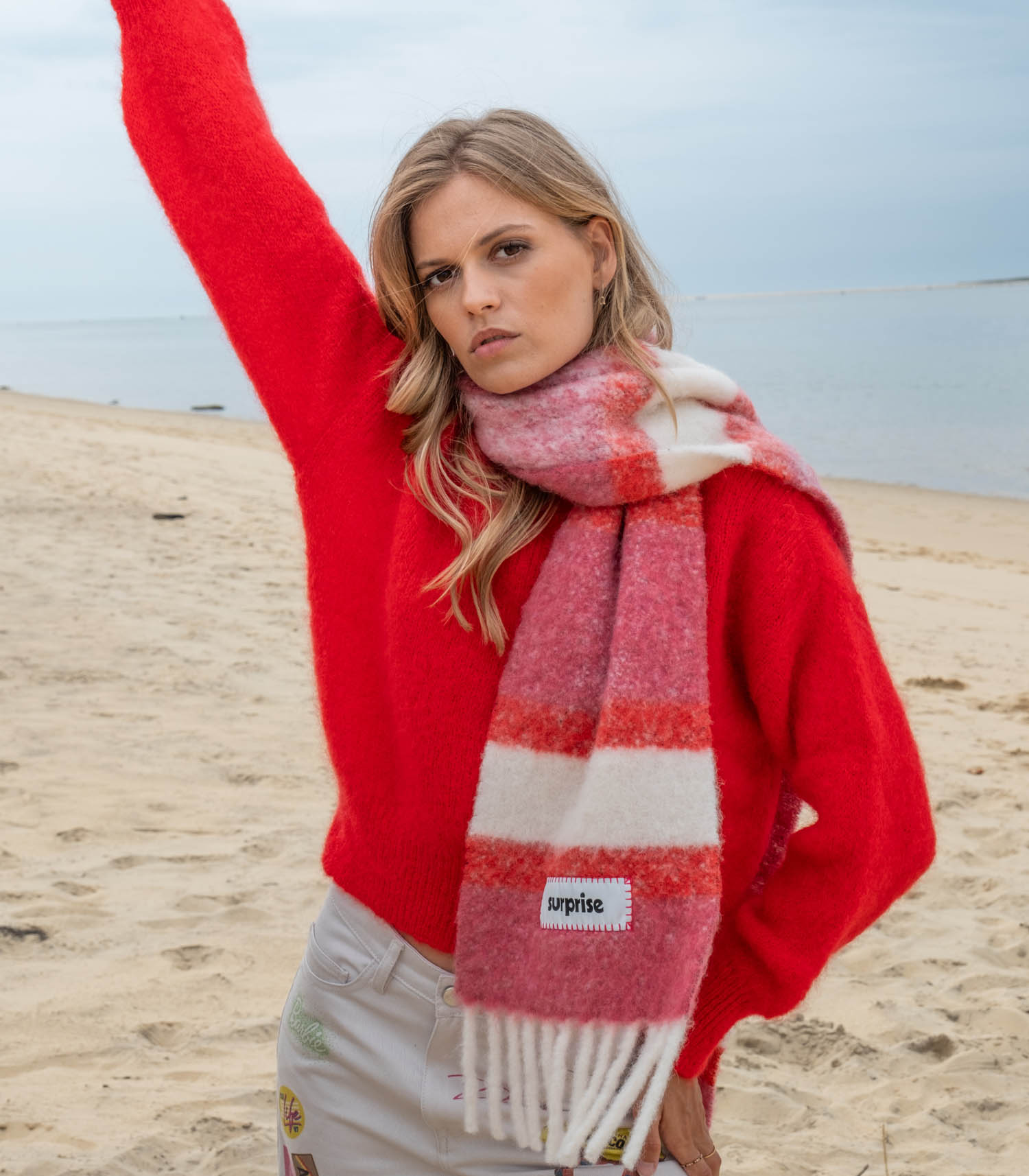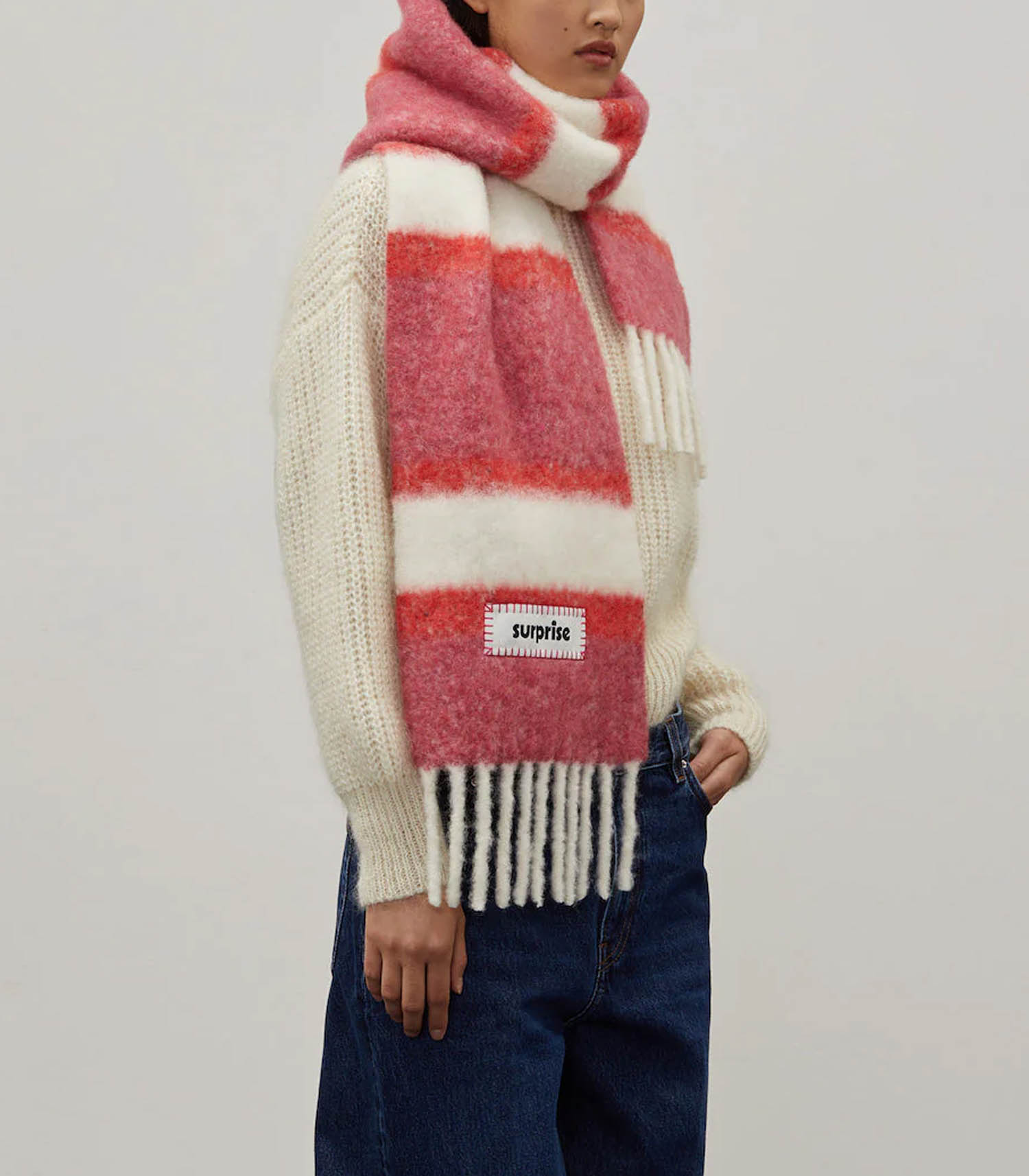 Longue et enveloppante, cette écharpe signée Suprise Paris est parfaite pour le retour des journées plus fraîches. Son desgin écru s'agrémente de larges rayures dans des teintes de rose et rouge.