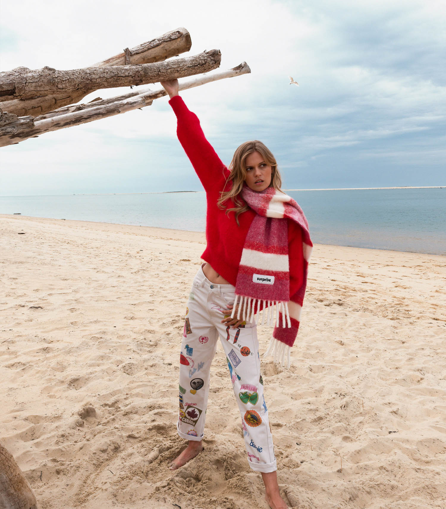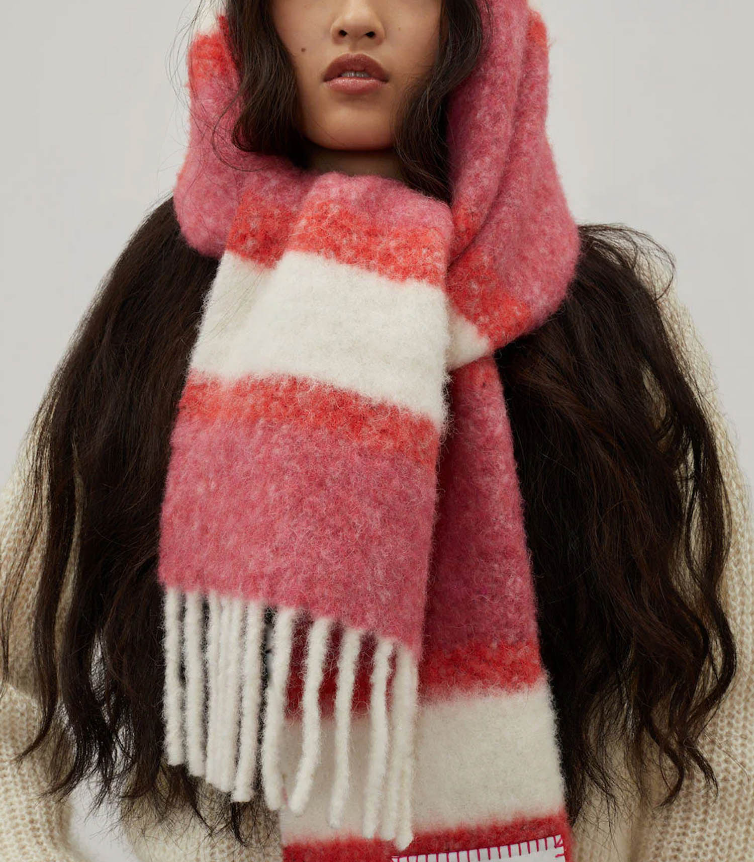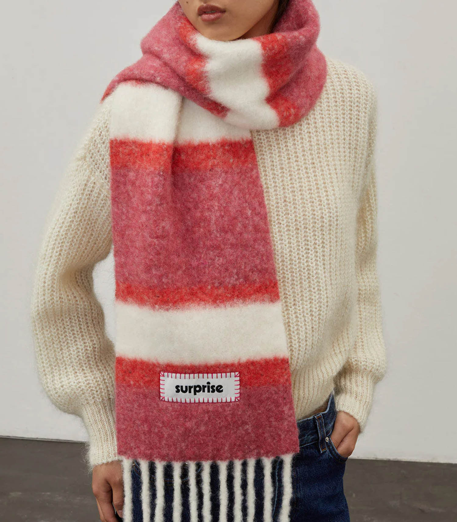 Longue et enveloppante, cette écharpe signée Suprise Paris est parfaite pour le retour des journées plus fraîches. Son desgin écru s'agrémente de larges rayures dans des teintes de rose et rouge.