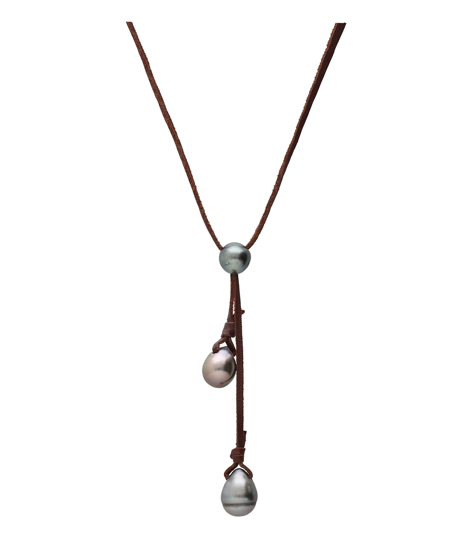 Collier Aritea 3 perles signé Tamahiné. Ce collier est monté sur un lien en cuir brun, dans une forme "Y". Il présente une perle d'eau douce grise à l'intersection, puis se découpe en 2 liens avec des perles d'eau douce grises aux extrémités.