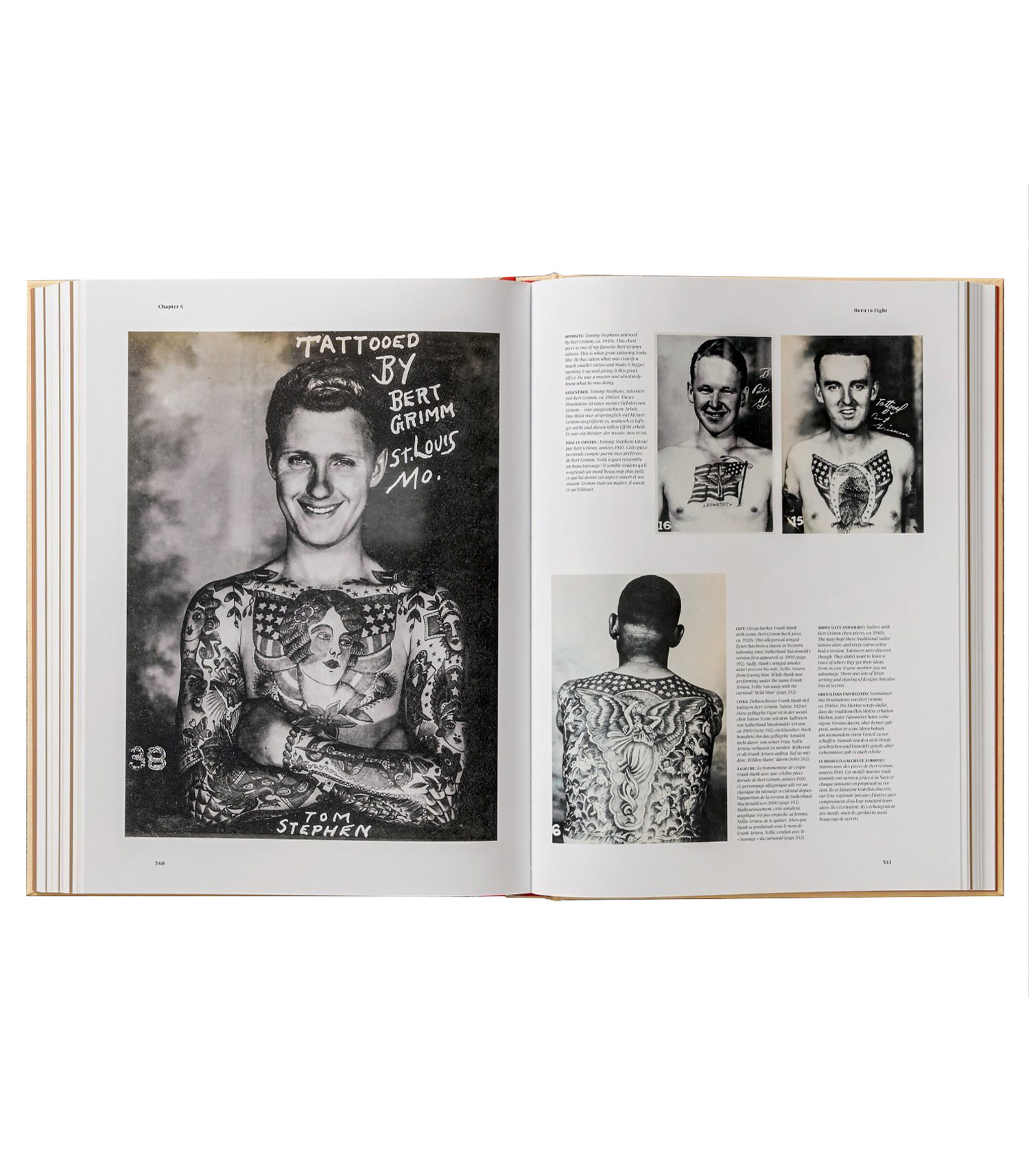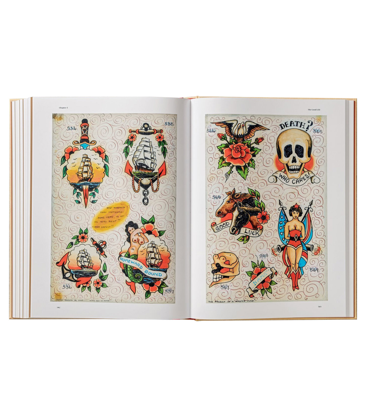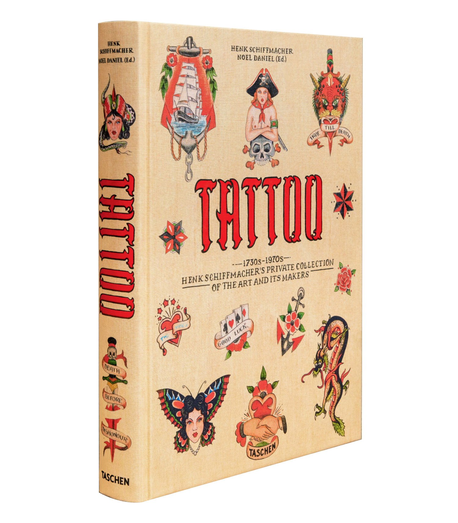 Livre XL The Tattoo Book : 1730-1070 aux éditions Taschen, réalisé par Henk Schiffmacher, historien et célèbre tatoueur. Un voyage personnel à travers l'histoire des tatouages de 1730 à 1970. Un ouvrage de taille XL regroupant des motifs et historiques remarquables. Une collection privée en édition spéciale limitée à 10 000 exemplaires numérotés.