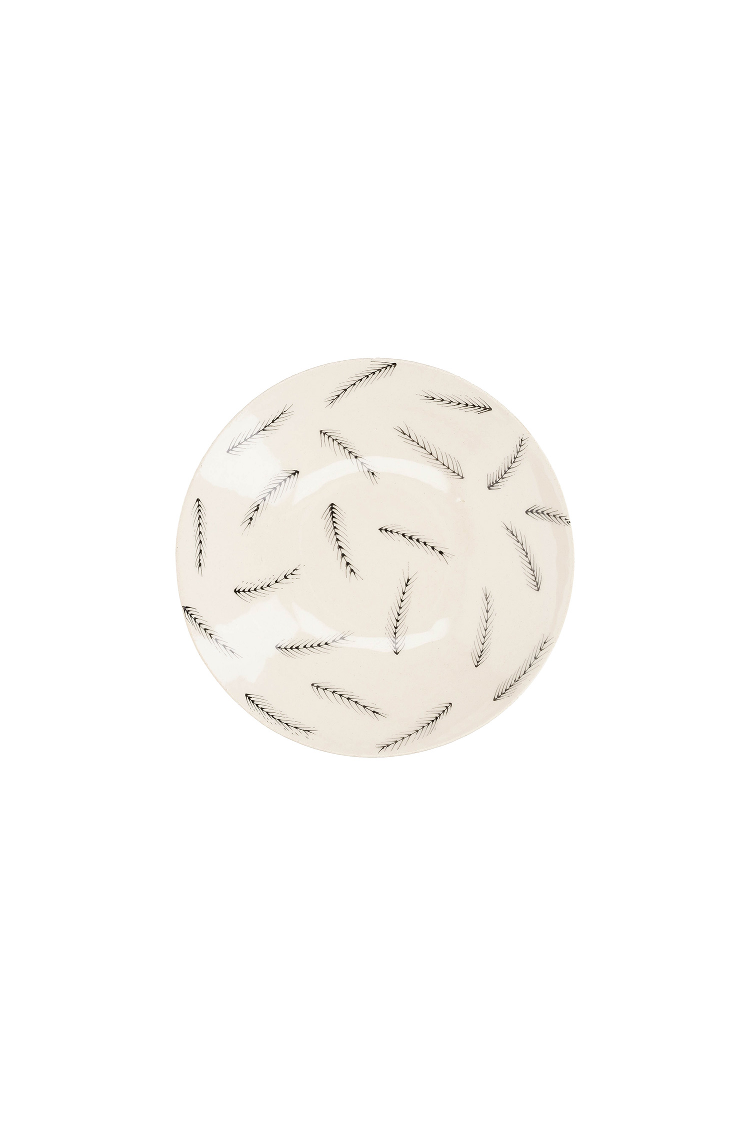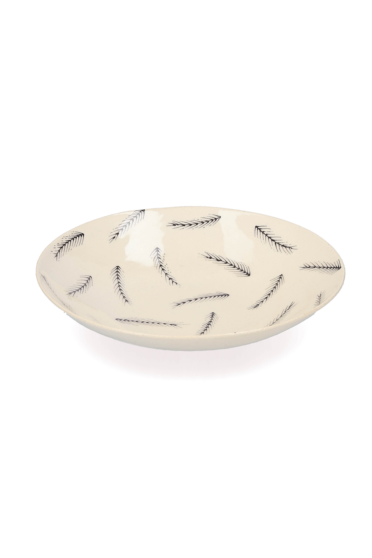 Assiette creuse en céramique beige recouverte de grandes plumes noires.