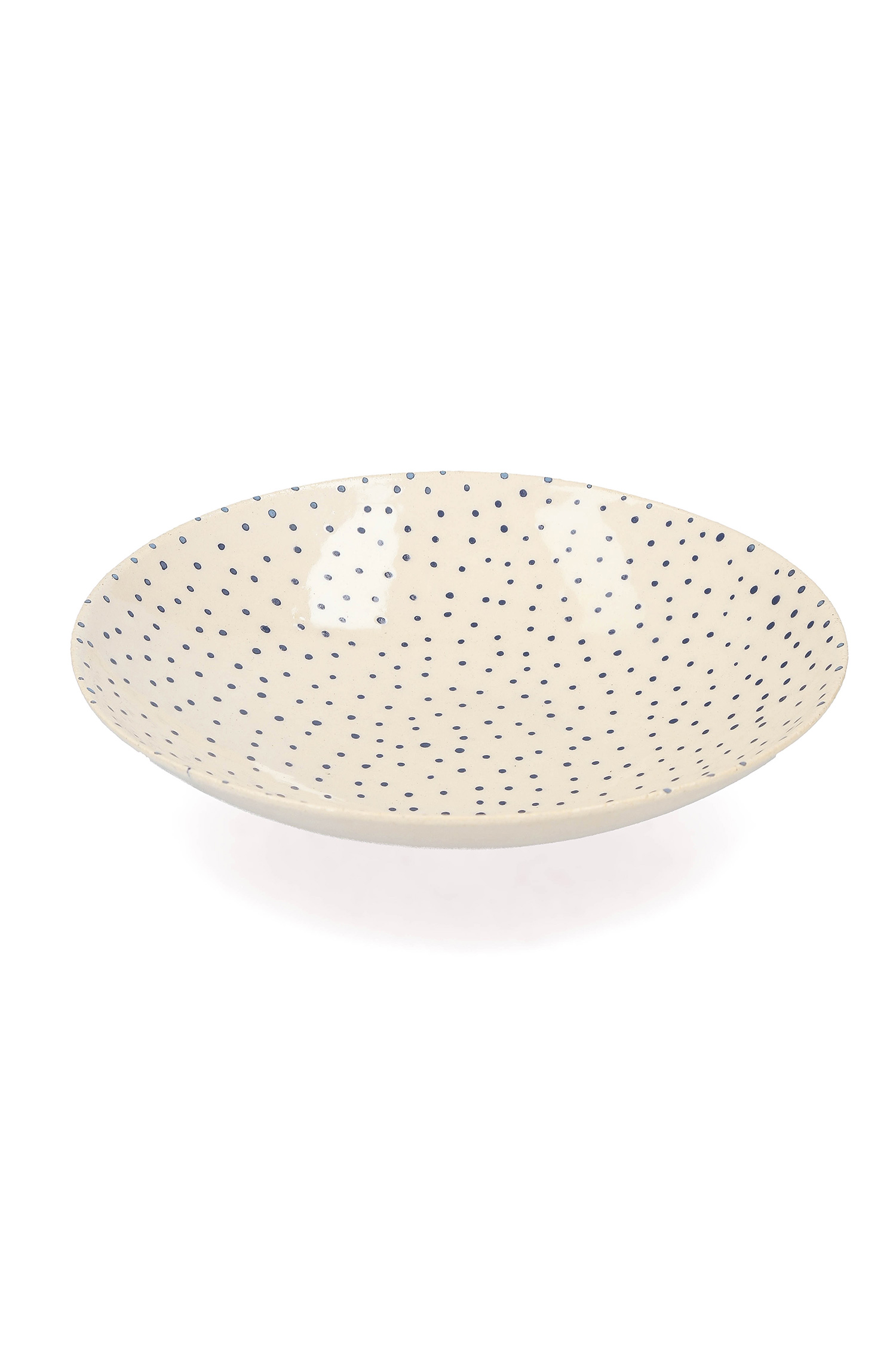 Assiette creuse en céramique beige recouverte de petits pois bleus.