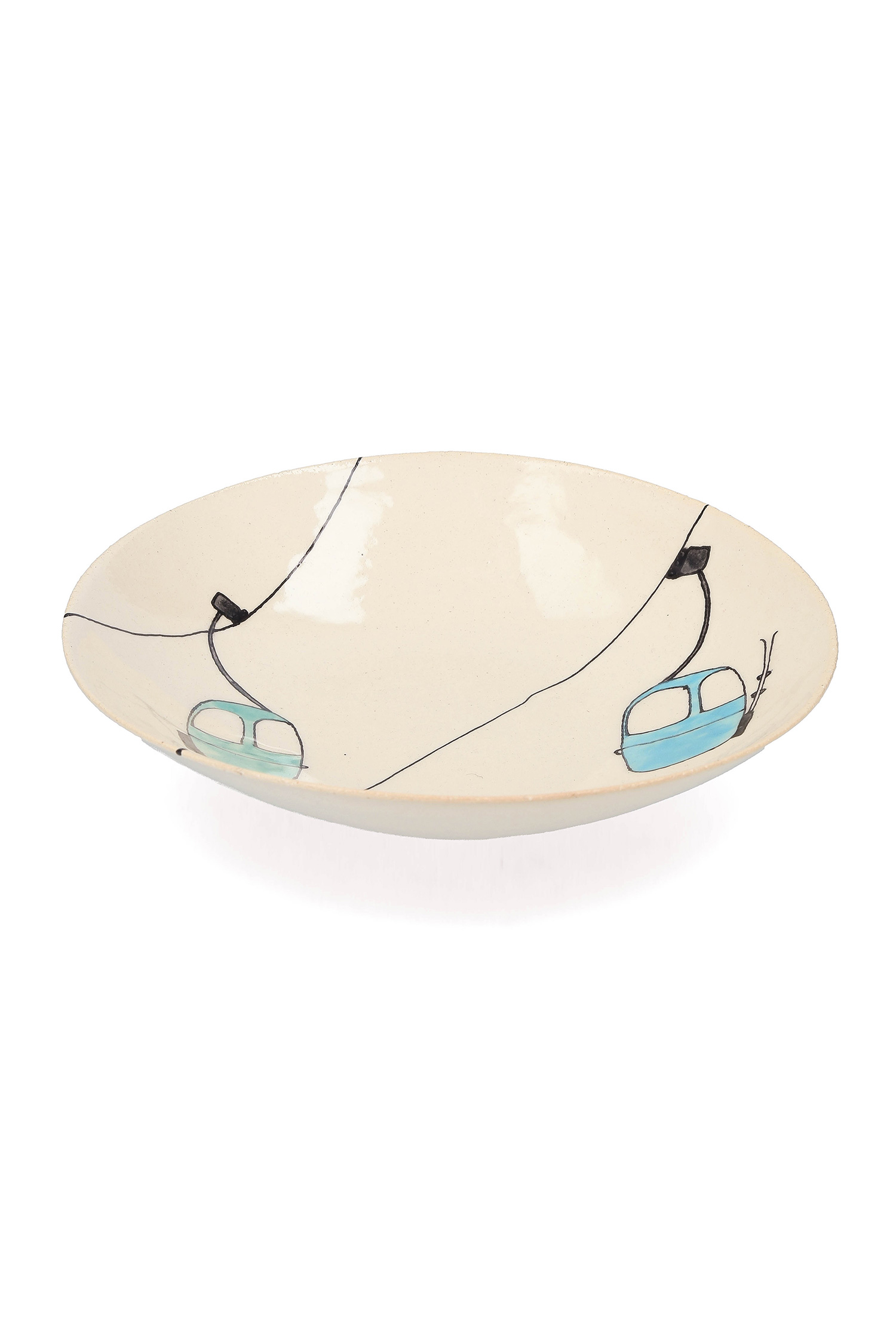 Assiette creuse en céramique beige avec deux télécabines, une verte et une bleue.
