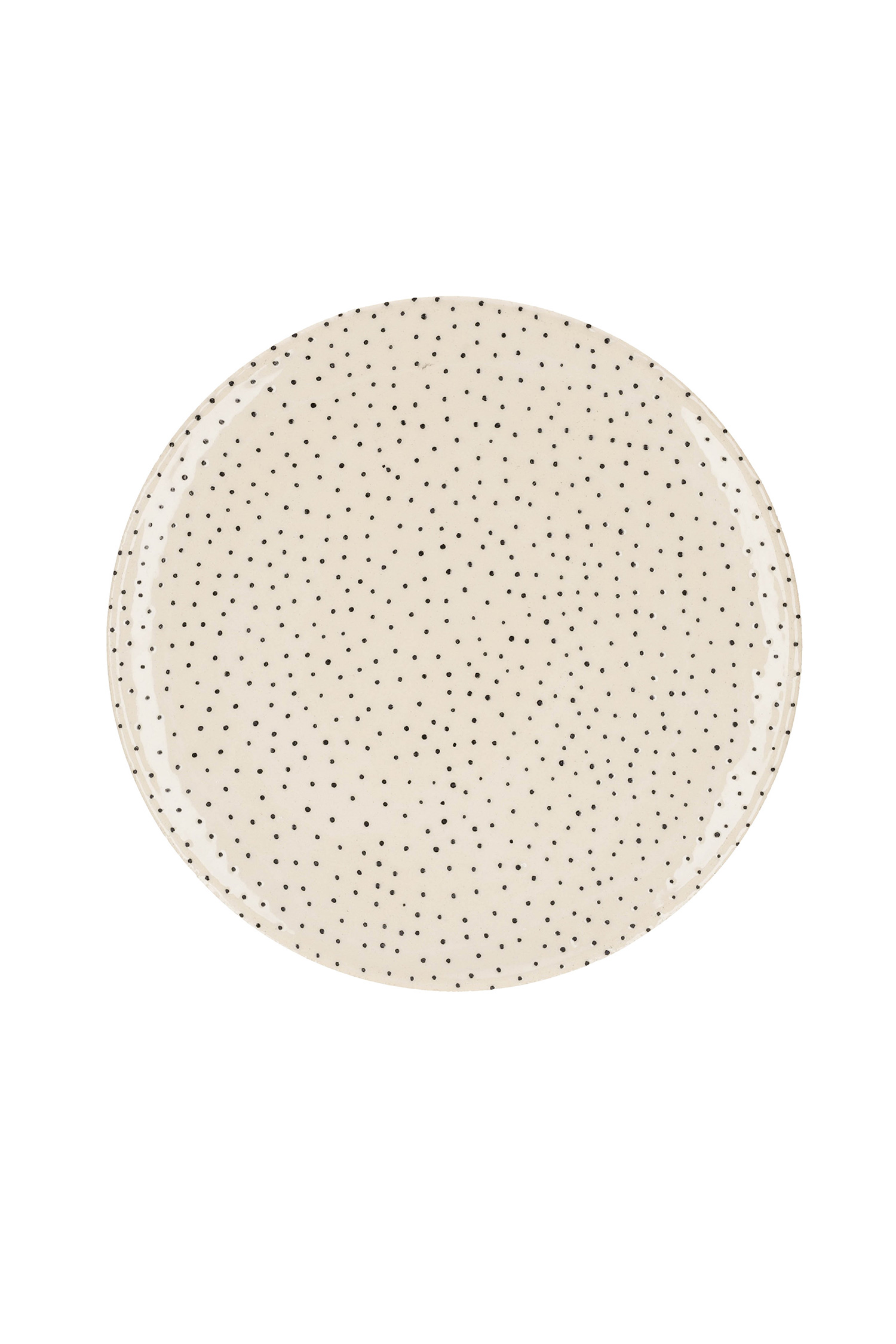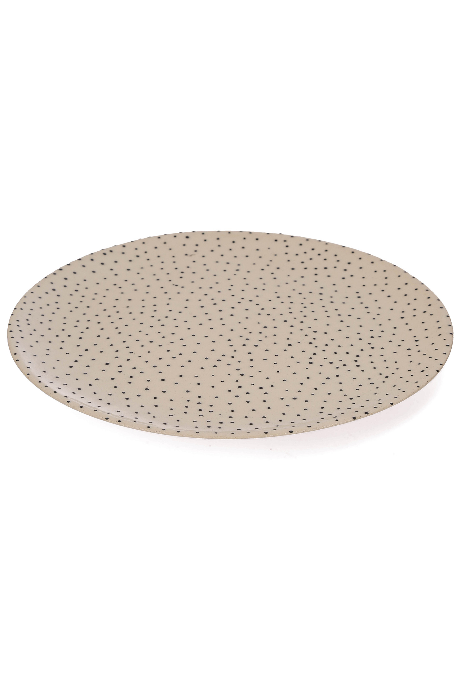 Grande assiette en céramique beige recouverte de petits pois noirs.