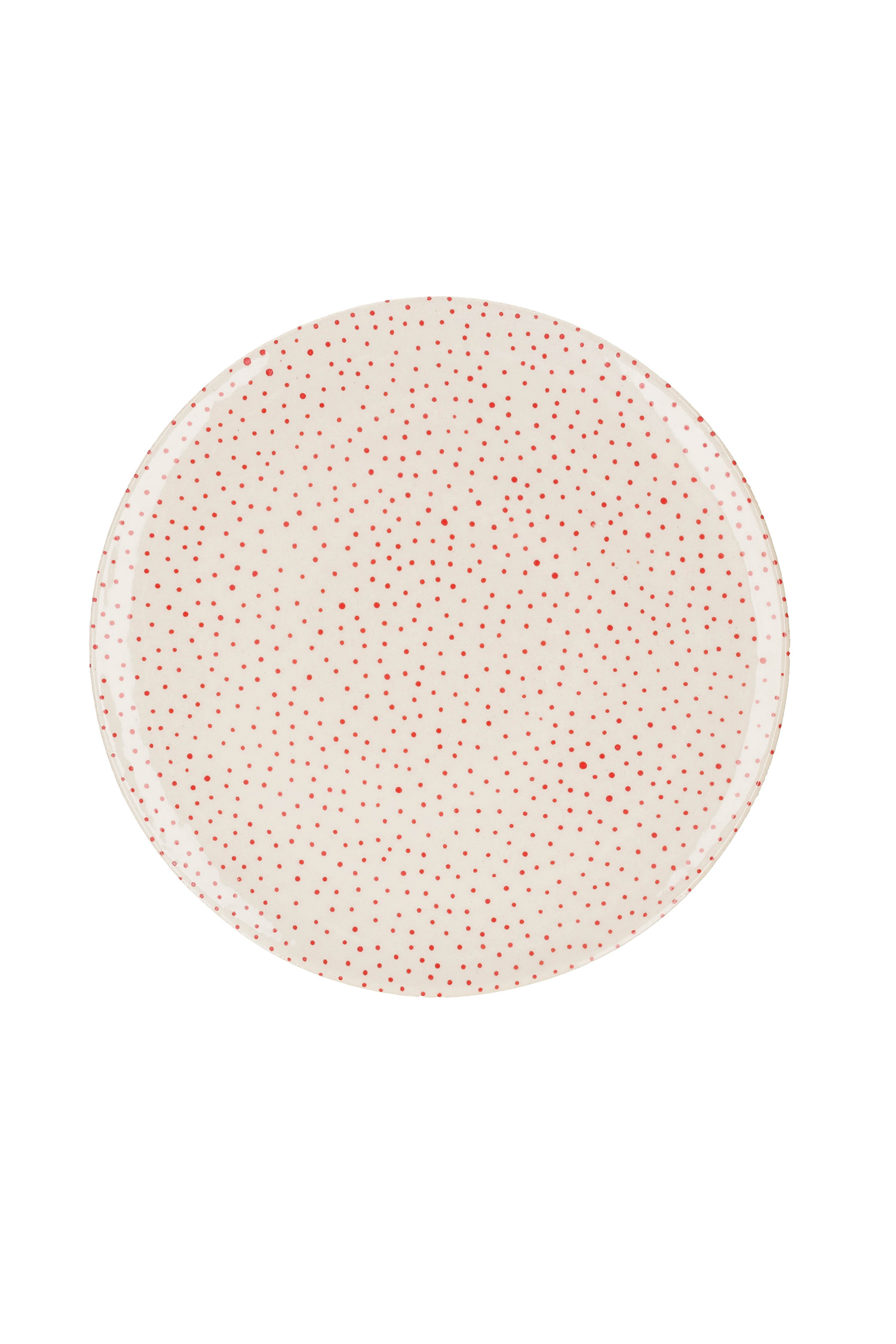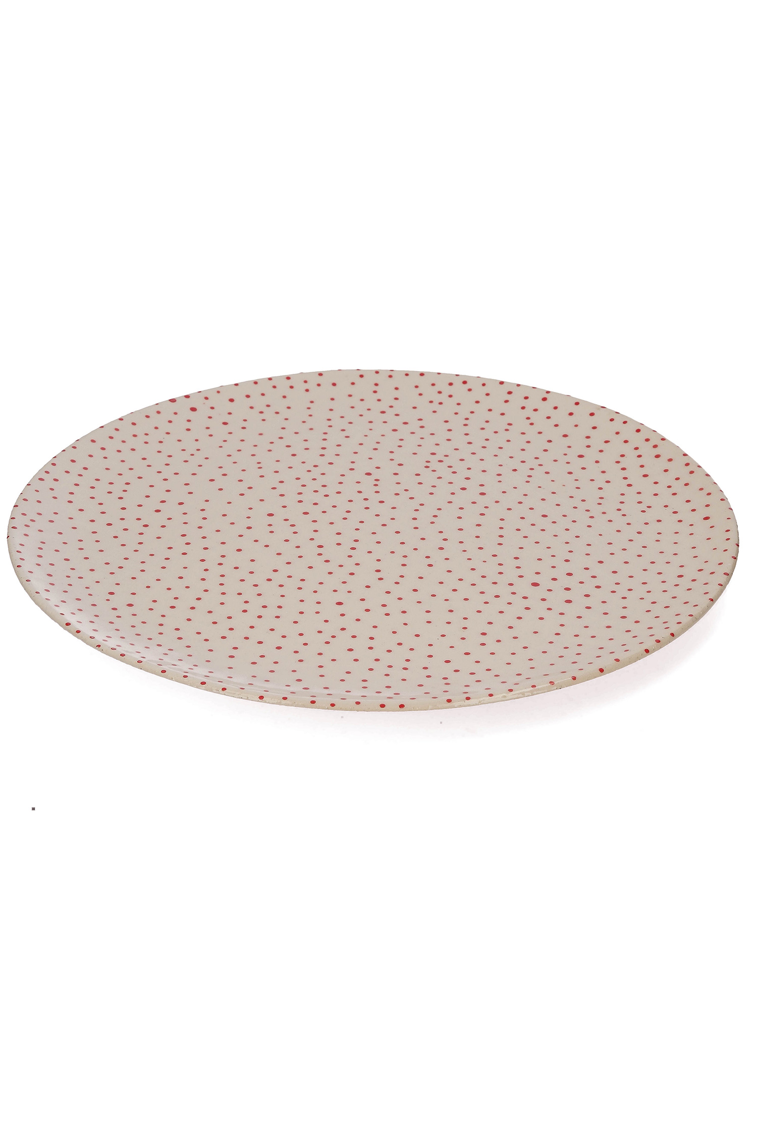 Grande assiette en céramique beige recouverte de petits pois rouges.