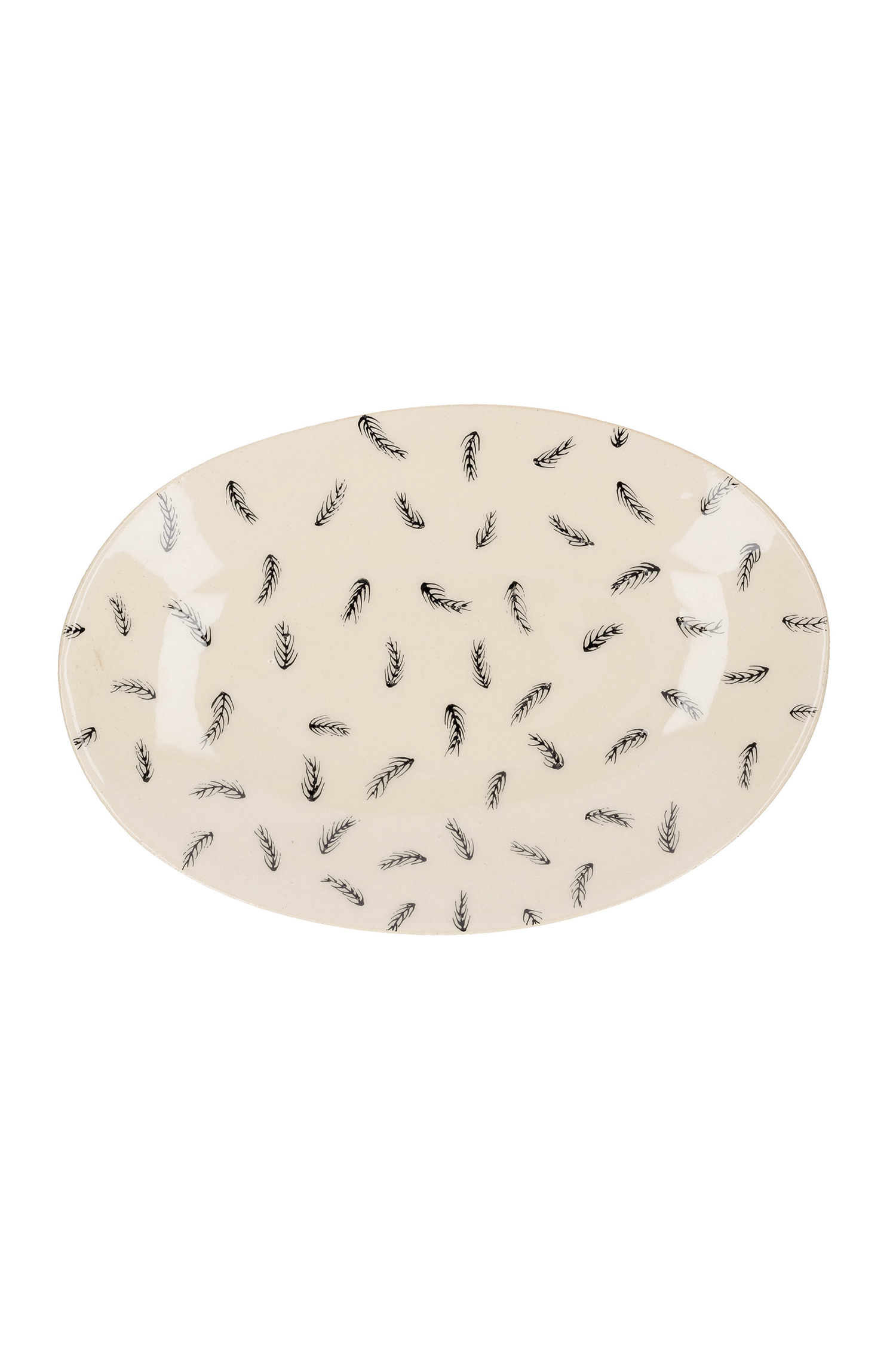 Petit plat en céramique beige recouvert de petites plumes noires.