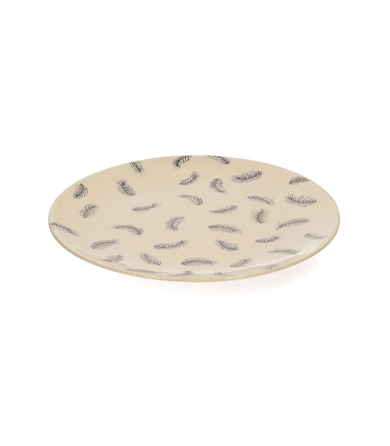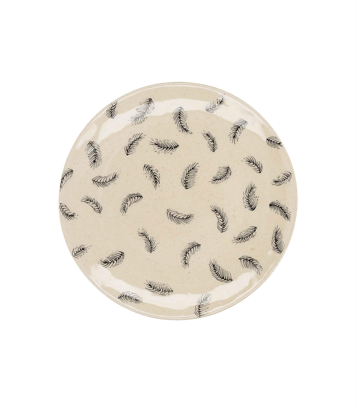 Petite assiette en céramique beige recouverte de petites plumes noires.