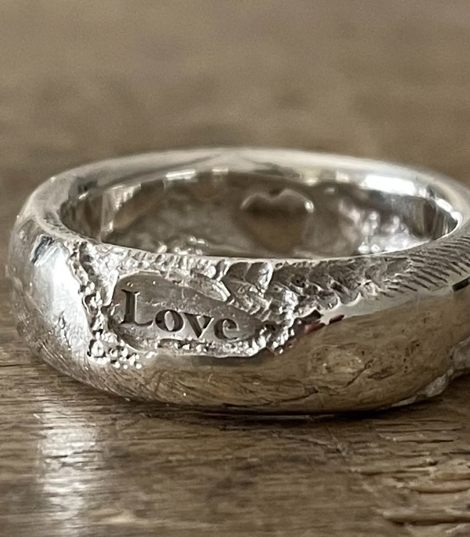 Bague The Dance de la marque Tó Garal. Cette élégante bague en argent massif présente une forme classique d'anneau, subtilement revisitée par un effet cassé volontaire qui lui confère une touche de modernité et d'originalité. Sur le devant de la bague, une délicate inscription "love" est finement gravée, ajoutant une dimension sentimentale et romantique.