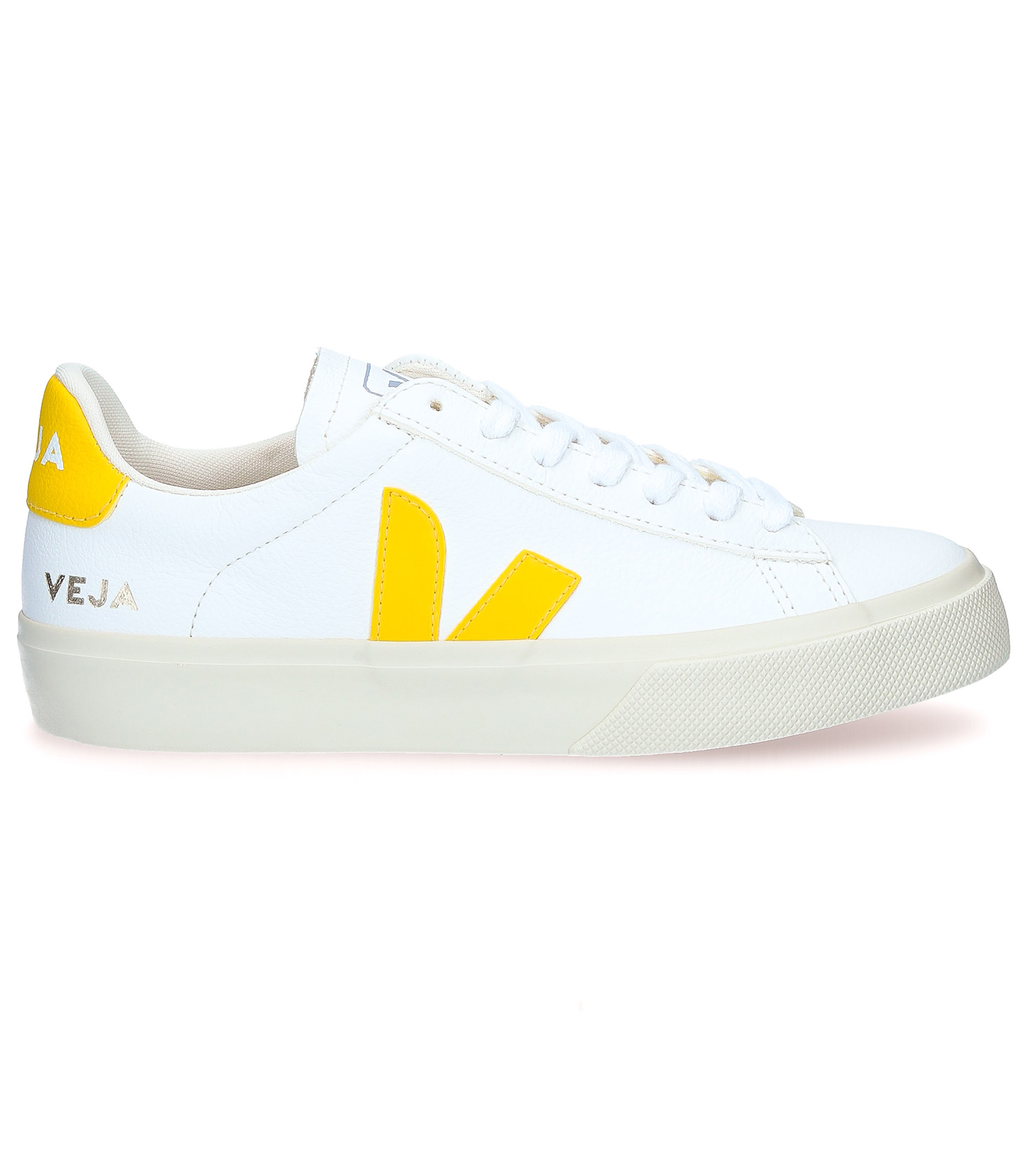 Baskets Veja Campo Chromefree Extra White Tonic, pensées pour le quotidien avec une tige en cuir lisse blanc intemporelle et agrémentée de détails jaune fluo pour une touche vitaminée.